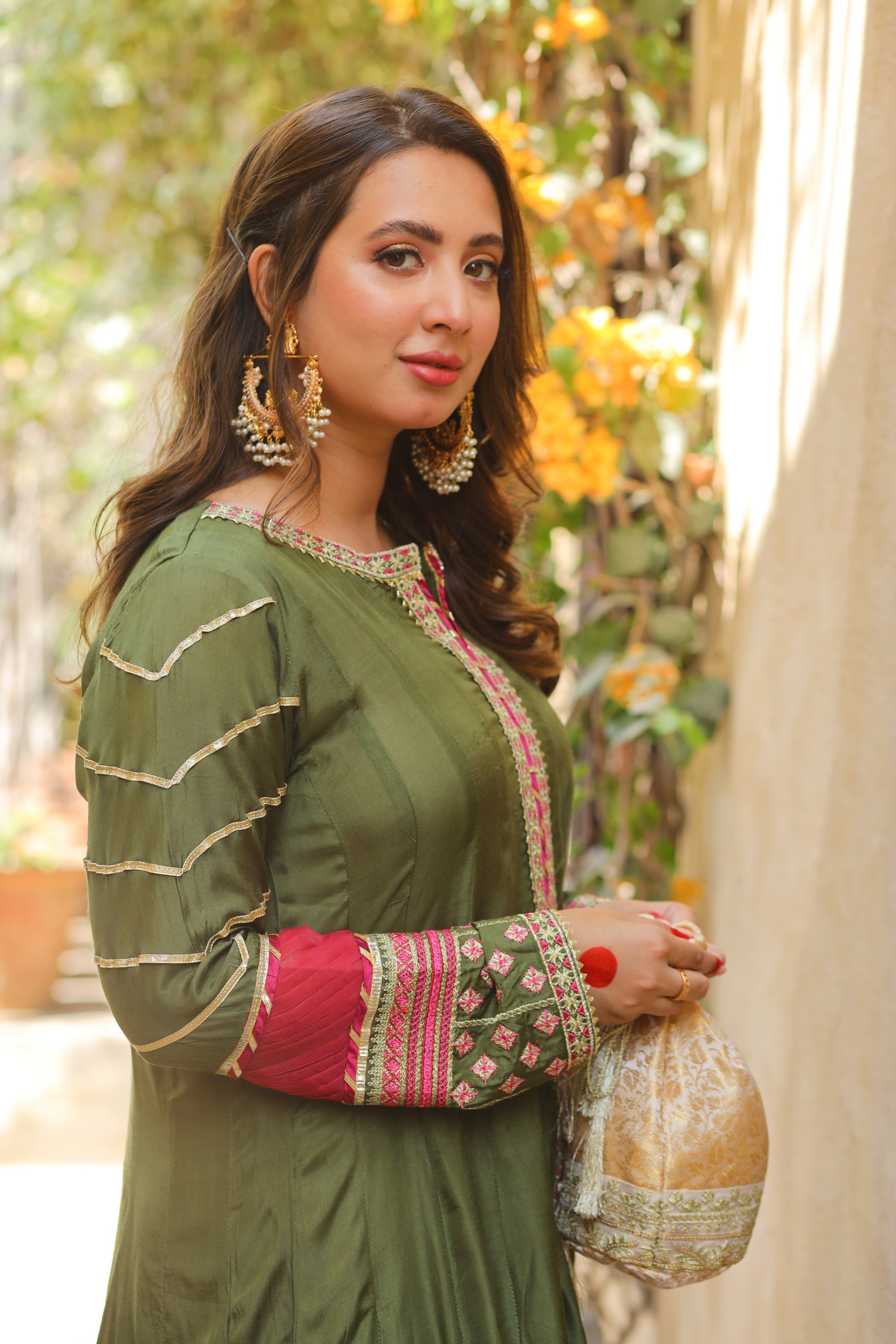 Aashna is a front open kalidaar olive green frock, it has zari and resham embroidery chatapatti and samosa lace detailings on neckline and front, and gota lace on daaman. The sleeves have heavy embroidery, organza pleat details, dhanak and samosa lace finishing. Dupatta has gold screen printing design with pink paltawa to complete the look.