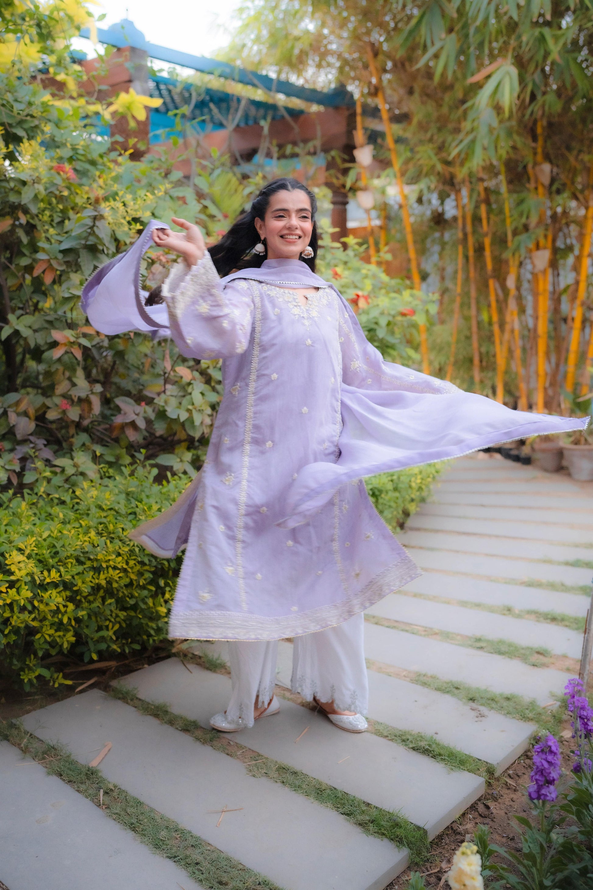 Haya is our Lavender color paneled kurta, inspired by the intricate craftsmanship of Multani embroidery. This kurta features delicate floral chann on the front with heavily embroidered daman, panels are adorned with embroidery and lace, while embroidery and lace details adorn the neckline. Sleeves feature similar embroidery with florals and heavy border while sleeve hems are adorned with fabric cone (samosa) stitching details.