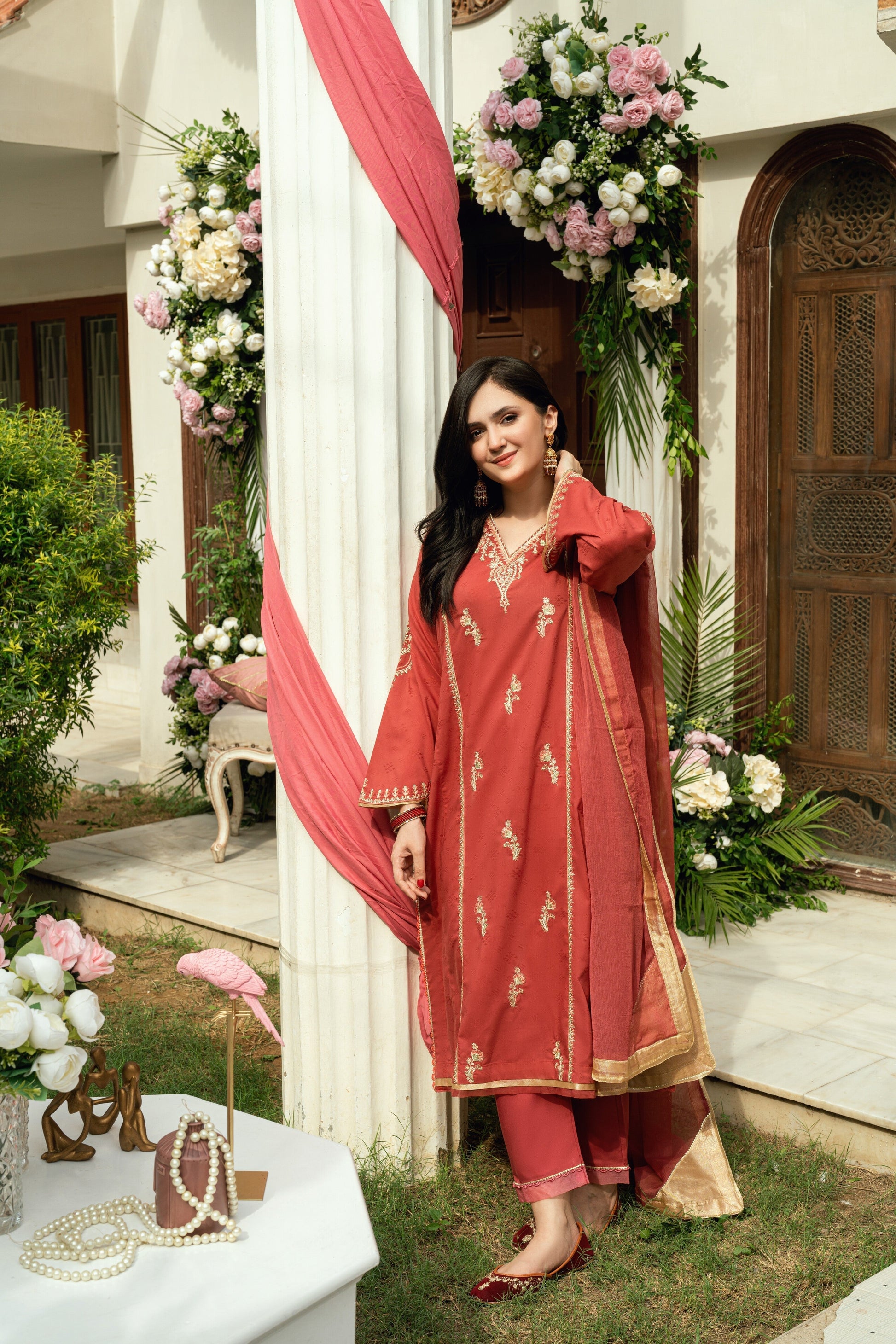 Vibrant and chic, our Coral Dobby outfit showcases a long, paneled shirt made from rich poly jaquard fabric. The V-neckline is defined with intricate slits, and the bell sleeves feature statement embroidery and cutwork details on the hem, finished with gold maysuri and organza touches. Matching straight pants with organza and lace details pair perfectly with a matching chiffon dupatta adorned with gota and masuri details. Carry a coral organza embroidered potli bag with cute dori tassels and cutwork design to complete the ensemble.