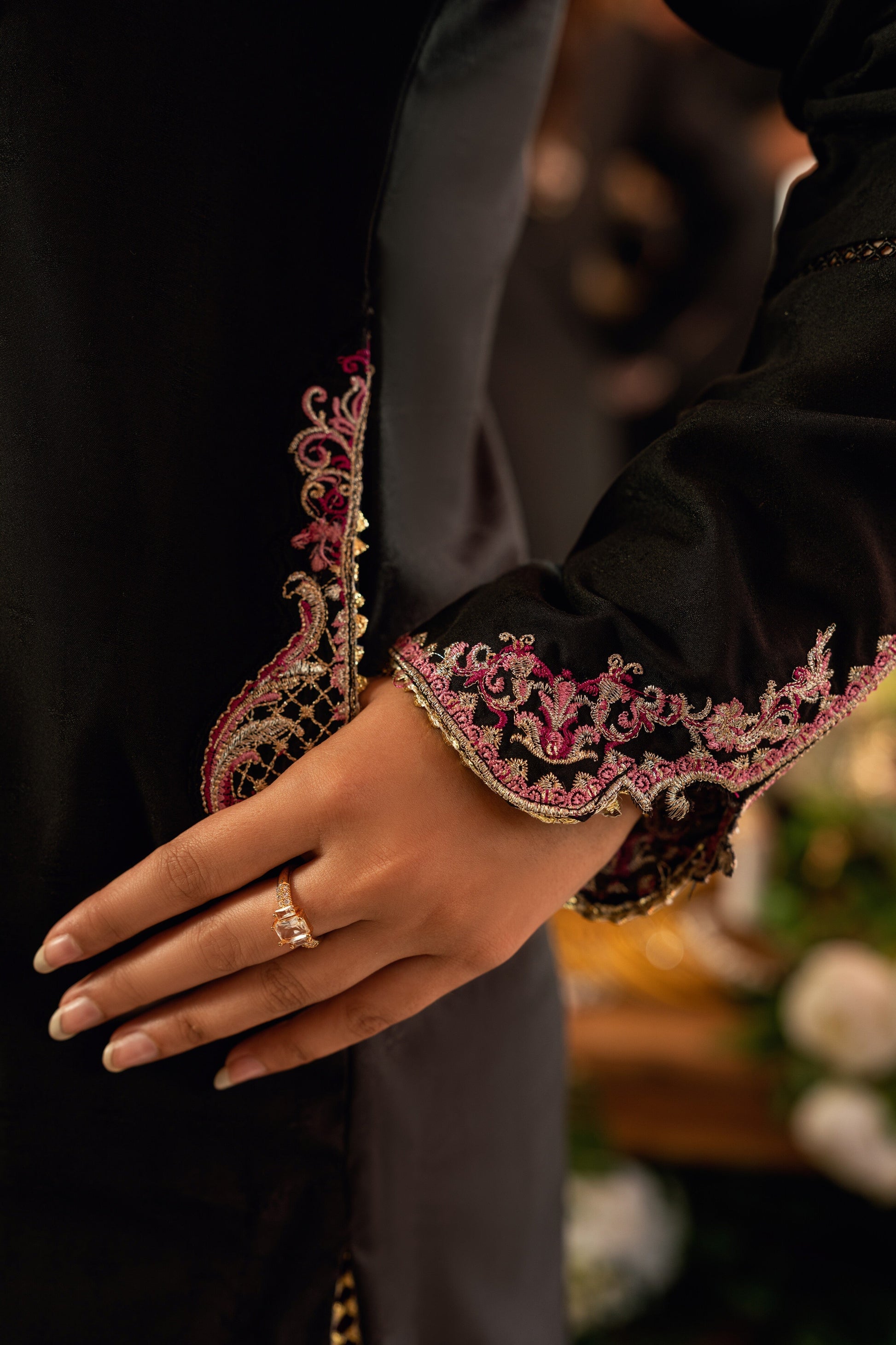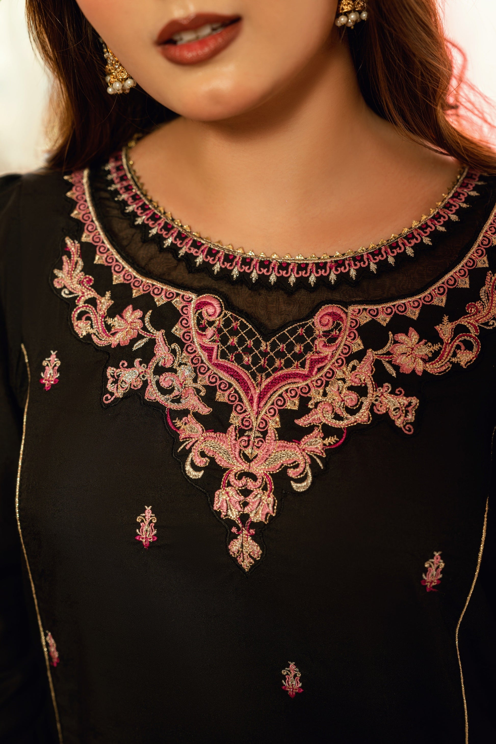 Shirt: Dramatic and sophisticated, our Black Dobby ensemble features a long, embroidered princess-paneled shirt with intricate neckline embroidery and organza patchwork. Embroidered pockets, puffy sleeves, and cutwork on the cuffs are complemented by a keyhole cut on the back neckline with fancy dory tassels.